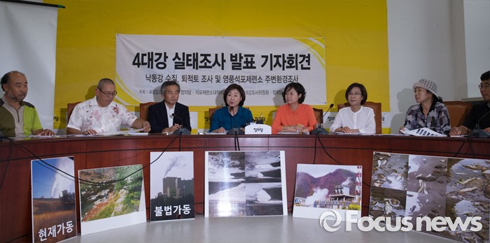 (서울=포커스뉴스) 심상정(왼쪽 네번째) 정의당 상임대표가 28일 오전 서울 여의도 국회에서 열린 낙동강 수질, 퇴적토 조사 및 영풍석포제련소 주변환경조사 관련 4대강 실태조 발표 기자회견에 참석해 인사말을 하고 있다.