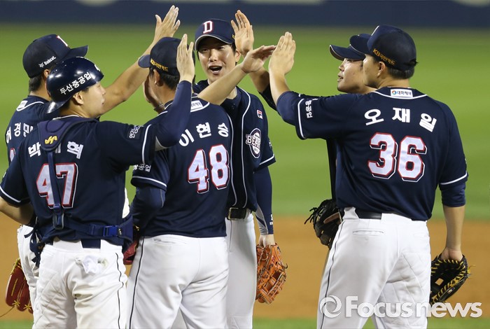 야구장 입장 시 응모함에 명함을 넣은 직장인을 대상으로 경품추첨 행사도 실시한다.(서울=포커스뉴스) 24일 서울 잠실구장에서 열린 2016 프로야구 두산-LG 경기에서 LG에 승리한 두산 선수들이 마우늗에 모여 하이파이브하며 기쁨을 함께하고 있다. 2016.07.24 우정식 기자
