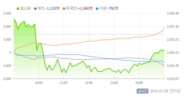 한편 이날 일본 닛케이225지수는 전일 대비 1.13% 하락한 1만6476.84로 마감했다.28일 유가증권시장 <그래픽출처=네이버>