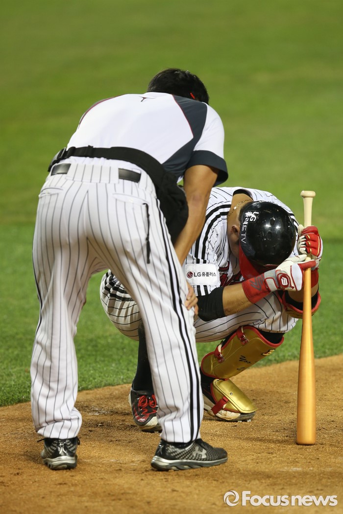 (서울=포커스뉴스) 28일 오후 서울 잠실구장에서 열린 2016 타이어뱅크 KBO리그 롯데-LG 경기에서 5회말 LG 유강남이 본인 타구에 맞고 쓰러져 있다.