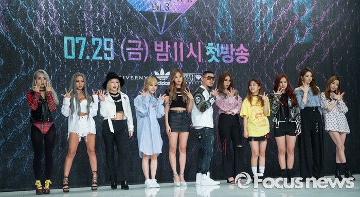 (서울=포커스뉴스) 29일 오전 서울 영등포구 타임스퀘어 아모리스홀에서 열린 Mnet '언프리티 랩스타 3' 제작발표회에 참석한 출연진이 포토타임을 갖고 있다. 왼쪽부터 그레이스, 나다, 미료, 유나킴, 육지담, 양동근, 자이언트 핑크, 전소연, 제이니, 케이시, 하주연.
