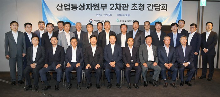 (서울=포커스뉴스) 우태희 산업통상자원부 2차관이 29일 서울 중구 소공동 플라자호텔 메이플룸에서 구자철 도시가스협회장, 유승배 서울도시가스 사장, 강병일 삼천리 대표, 나성오 강원도시가스 사장, 김병표 중부도시가스 사장, 태재광 전남도시가스 사장, 김문수 제주도시가스 사장을 비롯한 도시가스사 대표, 협회, 가스공사 등 관계자 50여명이 참석한 가운데 열린 도시가스사 사장단 간담회에 참석해 기념촬영을 하고 있다. <사진제공=산업통상자원부>