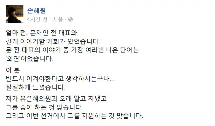 손혜원 의원은 이날 본인의 페이스북을 통해 "얼마 전 문재인 전 대표와 길게 이야기할 기회가 있었는데 가장 여러번 나온 단어는 '외연'이었다. '이 분 반드시 이겨야한다고 생각하시는구나'라고 절절하게 느꼈다"며 이같이 밝혔다.