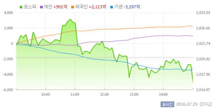 이날 코스피는 전일 대비 0.11% 상승한 2023.24로 장을 시작했다. 이후 지수는 외국인의 사자세에 힘입어 상승 폭을 확대했다. 그러나 장 중반 일본은행(BOJ)이 시장 기대치에 못 미치는 완화 정책을 발표하면서 하락세로 전환했다.