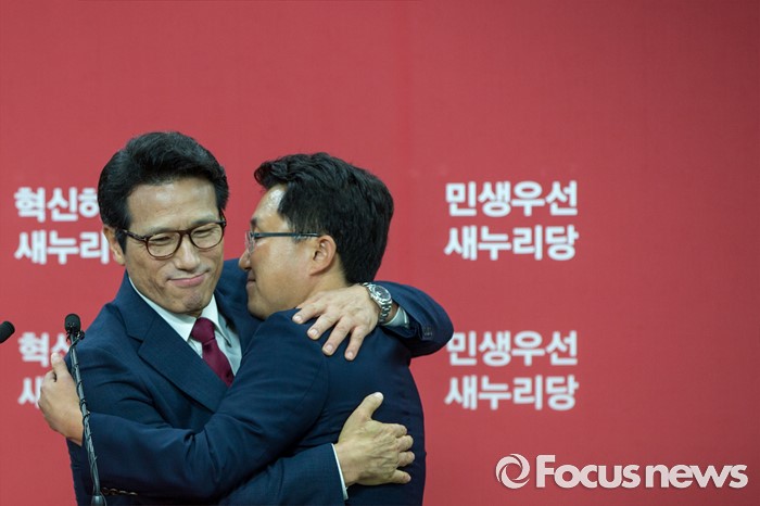 (서울=포커스뉴스) 새누리당 전당대회 대표최고위원 출마를 선언한 정병국(왼쪽), 김용태 의원이 29일 오후 서울 여의도 당사에서 단일화 발표 기자회견 중 포옹 하고 있다. 이날 두 의원은 여론조사를 통해 정병국 의원으로 단일화를 결정했다.