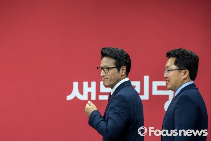 (서울=포커스뉴스) 새누리당 전당대회 대표최고위원 출마를 선언한 정병국(왼쪽), 김용태 의원이 29일 오후 서울 여의도 당사에서 단일화 발표 기자회견을 하기 위해 브리핑실로 들어서고 있다. 이날 두 의원은 여론조사를 통해 정병국 의원으로 단일화를 결정했다.