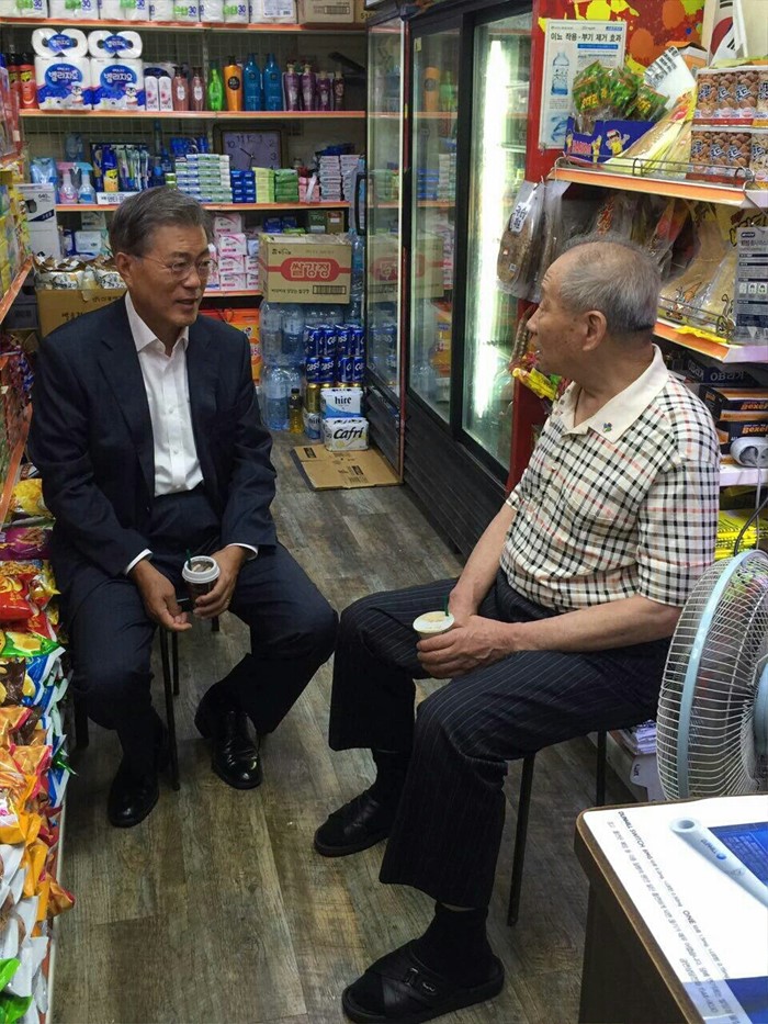 (서울=포커스뉴스) 문재인 더불어민주당 전 대표가 독립운동가 한태석 선생의 손자 상조 씨를 만난 내용을 29일 공개했다. 문 전 대표 의원실 트위터(@MoonJaeIn365)에 사진과 함께 '독립운동가 한태 석선생의 손자 한상조 어르신을 찾아뵀습니다. 작년 이 맘 때 뵙고 일 년 만입니다. 한창 더위에 잘 지내시는지, 여름 내의 사들고 가게를 찾았습니다. 나라가 어려울 때 분연히 일어선 독립운동가 후손에 대한 예우가 필요합니다'라는 글을 남겼다. <사진제공=문 전 대표 의원실 트위터>