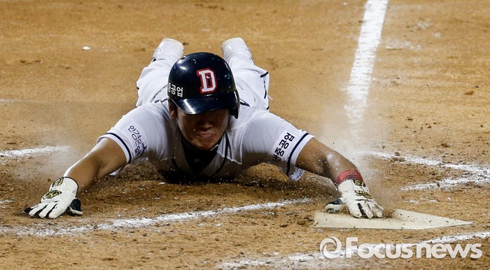 (서울=포커스뉴스) 26일 서울 잠실구장에서 열린 2016 프로야구 한화-두산 경기에서 4회말 1사 3루주자 허경민이 상대실책으로 홈을 터치하고 있다.