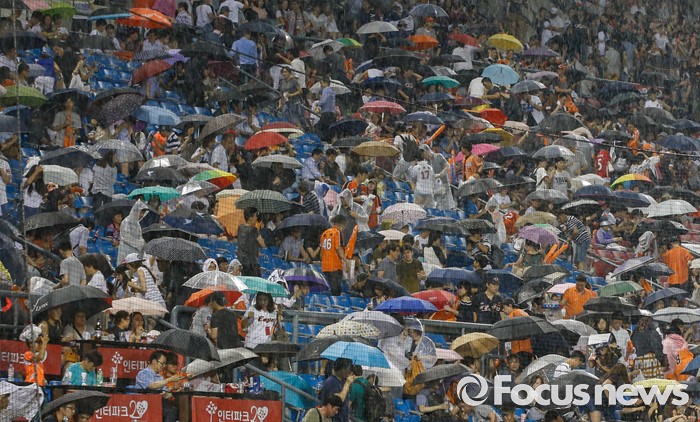 (서울=포커스뉴스) 26일 서울 잠실구장에서 열린 2016 프로야구 한화-두산 경기가 폭우로 중단된 가운데 관중들이 우산과 비옷으로 비를 피하고 있다.