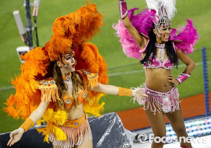 (서울=포커스뉴스) 26일 서울 잠실구장에서 열린 2016 프로야구 한화-두산 경기를 찾은 브라질 무용단이 열띤 공연을 펼치고 있다.