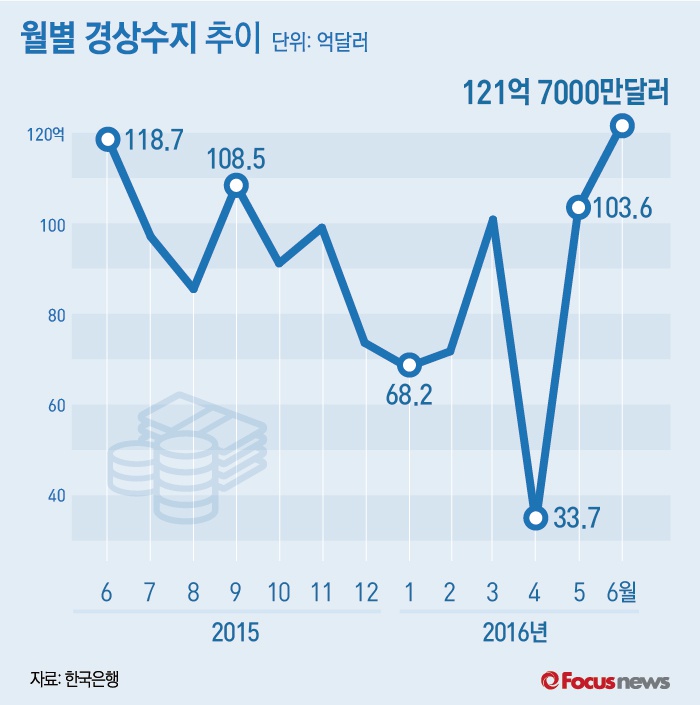(서울=포커스뉴스) 1일 한국은행이 발표한 ' 2016년 6월 국제수지(잠정)'에 따르면 올 6월 경상수지는 121억7000만달러 흑자로 역대 최대를기록했다. 경상수지는 2012년 3월 이후 52개월 연속 흑자를 기록하고 있다.