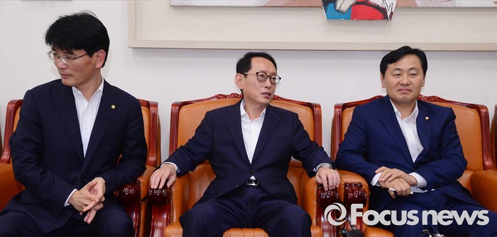 (서울=포커스뉴스) 1일 서울 여의도 국회에서 여야3당 원내수석부대표가 8월 임시국회 세월호 특별법 연장과 추경 등 현안 관련 공조 협의를 위한 회동에서 대화를 나누고 있다. 왼쪽부터 더불어민주당 박완주, 새누리당 김도읍, 국민의당 김관영.