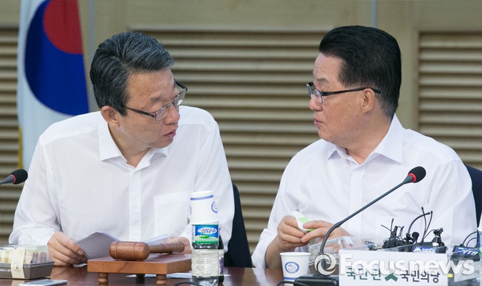 (서울=포커스뉴스) 2일 오전 서울 여의도 국회 의원회관에서 열린 국민의당 의원총회에 참석한 박지원(오른쪽) 비상대책위원장과 김성식 정책위의장이 대화하고 있다.