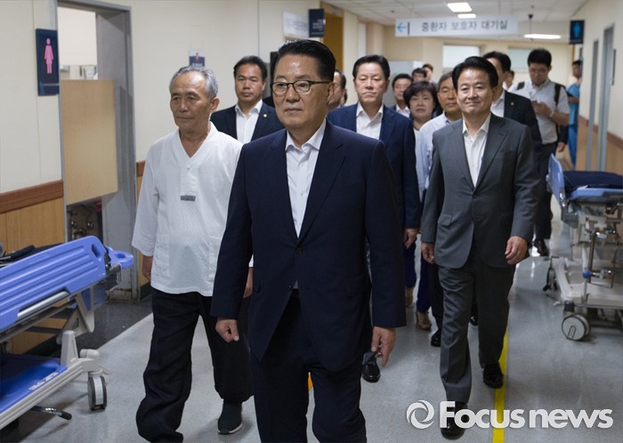 (서울=포커스뉴스) 박지원 국민의당 비상대책위원장과 의원들이 2일 종로구 서울대학교병원을 찾아 지난해 민중총궐기 당시 경찰의 물대포를 맞고 입원 중인 백남기 농민을 위로 방문하기 위해 이동하고 있다.