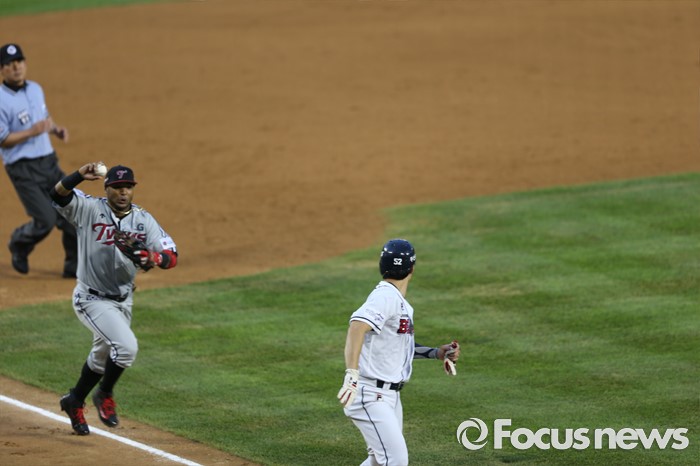 | △ 런다운시키려 김재호 쫓는 히메네스 |