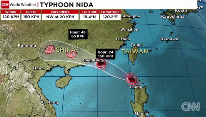 태풍 니다는 지난달 30일 필리핀 북부에 상륙해 287㎜의 비를 쏟았다. 이후 홍콩과 중국 남서부로 북서진하고 있다.홍콩이 2일(현지시간) 태풍 4호 '니다(Nida)'의 영향권에 들어 비상에 걸렸다. <사진출처=미국 CNN>