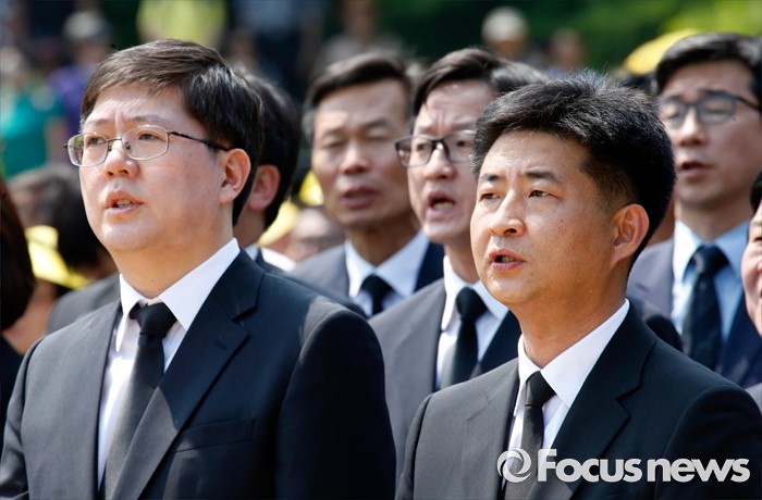 검찰개혁에 대해선 "사실 여당이 반대할 이유가 별로 없다. 그 분들도 나중에 야당이 돼 검찰에 당할 수도 있는 것"이라며 "공수처, 기소권과 수사권의 분리 등 거론되는 모든 문제가 시급한 문제니 다 동원돼 검찰개혁이 이뤄져야 한다고 본다"고 덧붙였다.(김해=포커스뉴스) 23일 오후 경남 김해 봉하마을에서 엄수된 故 노무현 전 대통령 서거 7주기 추도식에 참석한 노 전 대통령의 장남 건호(오른쪽) 씨와 김홍걸 더불어민주당 국민통합위원장이 임을 위한 행진곡을 부르고 있다. 2016.05.23 김흥구 기자