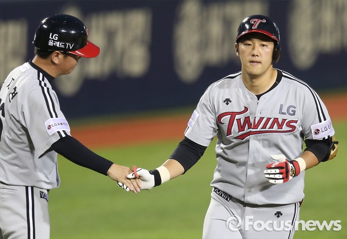(서울=포커스뉴스) 3일 서울 잠실구장에서 열린 2016 프로야구 LG-두산 경기 4회초 무사 3루에서 LG 양석환이 좌월 2점 홈런을 날리고 3루를 돌며 유지현 코치와 악수하고 있다.