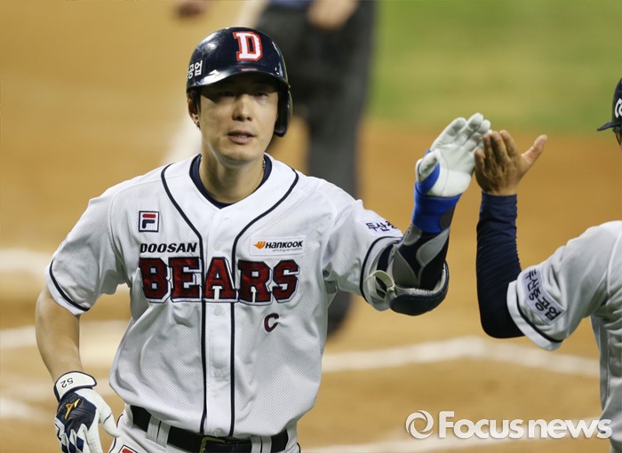 (서울=포커스뉴스) 3일 서울 잠실구장에서 열린 2016 프로야구 LG-두산 경기 6회말 두산 김재호가 좌월 솔로 홈런을 치고 강동우 코치의 환영을 받으며 홈인하고 있다.