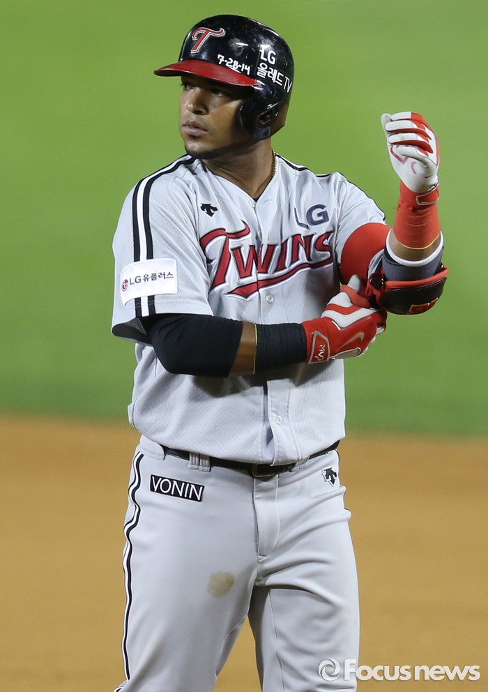 (서울=포커스뉴스) 3일 서울 잠실구장에서 열린 2016 프로야구 LG-두산 경기 8회초 2사 만루에서 LG 히메네스가 2타점 중전 적시타를 치고 1루에서 팔꿈치 보호대를 풀고 있다.