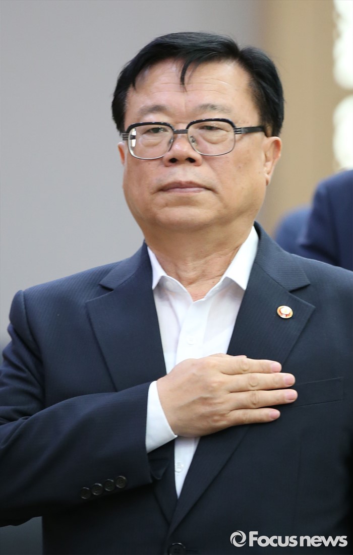 (세종=포커스뉴스) 2일 오전 세종시 정부세종청사 국무회의장에서 열린 청와대-세종 영상 국무회의에서 이동필 농림축산식품부장관이 국기에 대한 경례를 하고 있다.