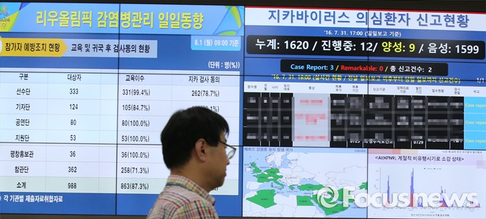 (청주=포커스뉴스) 2016 브라질 리우올림픽을 앞둔 1일 오후 충북 청주 흥덕구 오송 질병관리본부에 설치된 리우올림픽 감염병 대응 긴급상황실에서 관계자들이 지카바이러스 감염병 발생 동향 등을 살피고 있다.