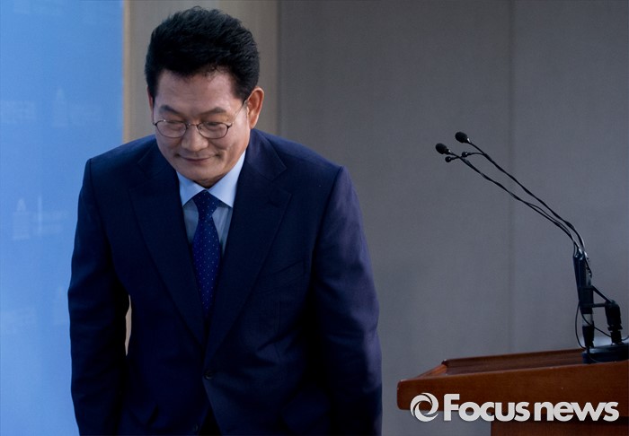 (서울=포커스뉴스) 전당대회 출마를 송영길 더불어민주당 의원이 4일 오전 서울 여의도 국회 정론관에서 공약 발표 기자회견을 마친 뒤 인사하고 있다.