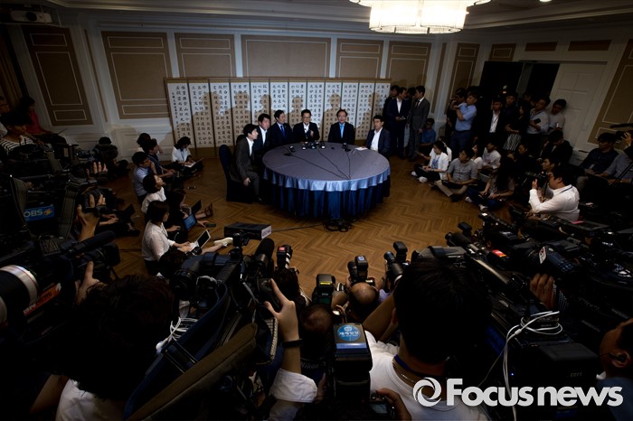 (서울=포커스뉴스) 야3당 원내대표가 3일 오전 서울 여의도 국회에서 열린 원내대표 회동에 참석해 인사를 나눈 뒤 회의시작을 기다리고 있다. 왼쪽 세 번째부터 우상호 더불어민주당 원내대표, 박지원 국민의당 원내대표, 노회찬 정의당 원내대표.