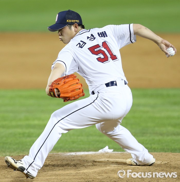 (서울=포커스뉴스) 3일 서울 잠실구장에서 열린 2016 프로야구 LG-두산 경기 8회초 두산 투수 김성배가 투구하고 있다.