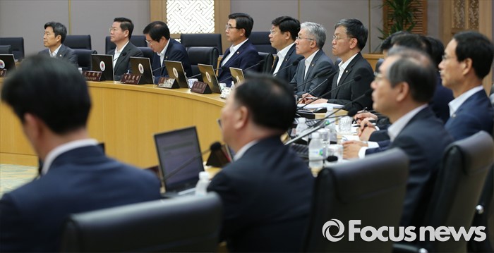(세종=포커스뉴스) 2일 오전 세종시 정부세종청사 국무회의장에서 열린 청와대-세종 영상 국무회의에서 국무위원들이 박근혜 대통령의 모두발언을 듣고 있다.