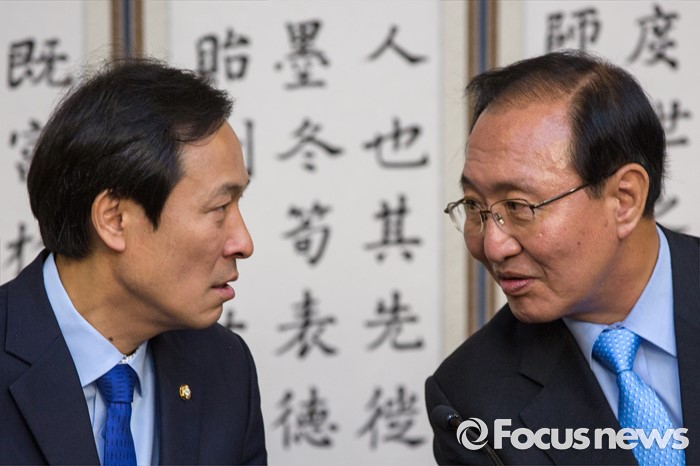 (서울=포커스뉴스) 우상호(왼쪽) 더불어민주당 원내대표와 노회찬 정의당 원내대표가 3일 오전 서울 여의도 국회에서 열린 원내대표 회동에 참석해 대화 하고 있다.