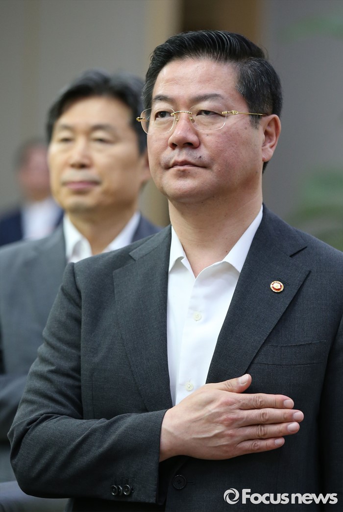 (세종=포커스뉴스) 2일 오전 세종시 정부세종청사 국무회의장에서 열린 청와대-세종 영상 국무회의에서 성영훈(오른쪽) 국민권익위원장이 국기에 대한 경례를 하고 있다.