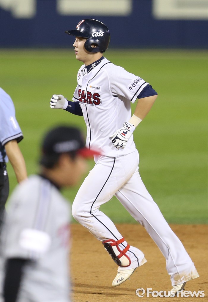 (서울=포커스뉴스) 3일 서울 잠실구장에서 열린 2016 프로야구 LG-두산 경기 8회말 1사후 두산 박건우가 중월 솔로 홈런을 치고 베이스를 돌고 있다.