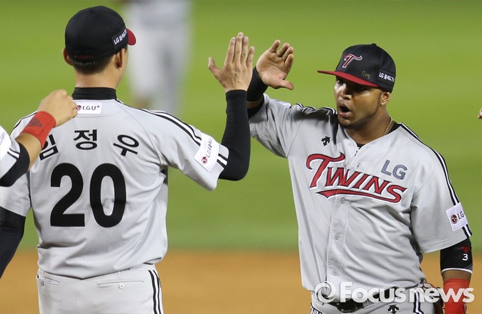 (서울=포커스뉴스) 3일 서울 잠실구장에서 열린 2016 프로야구 LG-두산 경기에서 두산을 물리친 LG의 마무리투수 임정우와 히메네스가 하이파이브하고 있다.