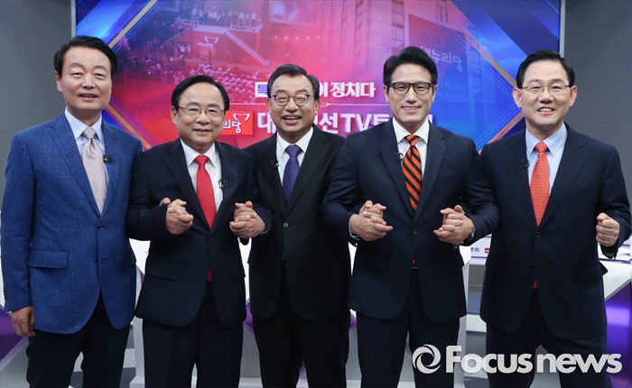 한편 전당대회가 6일 앞으로 다가온 가운데, 합동연설회는 오는 5일 충청권 연설회와 오는 6일 수도권 합동연설회가 남게 된다.1일 오후 서울 중구 TV조선 스튜디오에서 새누리당 대표 경선 TV토론회에 앞서 의원들이 포즈를 취하고 있다. 왼쪽부터 한선교, 이주영, 이정현, 정병국, 주호영 의원. 2016.08.01 사진공동취재단