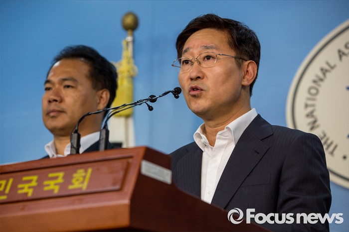 (서울=포커스뉴스) 박범계(오른쪽) 더불어민주당 의원과 이용주 국민의당 의원이 2일 오후 서울 여의도 국회에서 고위공직자 비리수사처 관련 경과 및 향후 일정에 대해 발표 하고 있다.