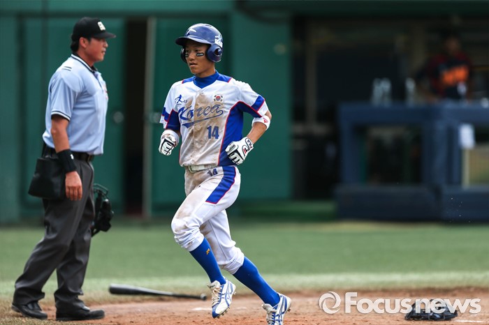 (서울=포커스뉴스) 1일 오후 서울 양천구 목동종합운동장에서 열린 2016 세계 청소년 야구 대회 '한국A VS 일본A' 경기에서 2회초 변중섭 선수가 홈으로 세이프하며 득점하고 있다.