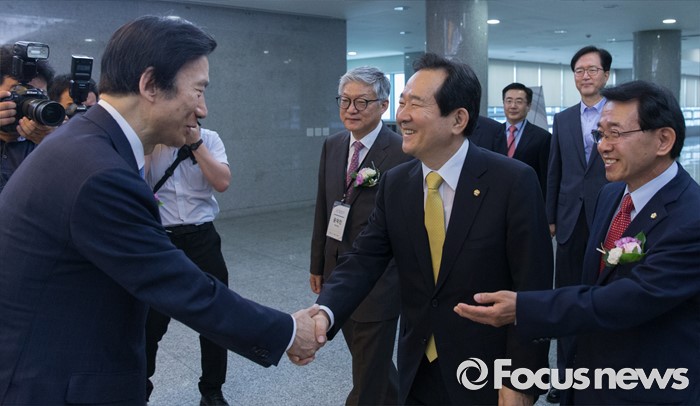 (서울=포커스뉴스) 3일 오전 서울 여의도 국회 의원회관에서 열린 공공외교법 발효기념 심포지엄에 참석한 정세균(가운데) 국회의장과 심재권(오른쪽) 국회 외교통일위원장, 윤병세 외교부 장관이 인사하고 있다.