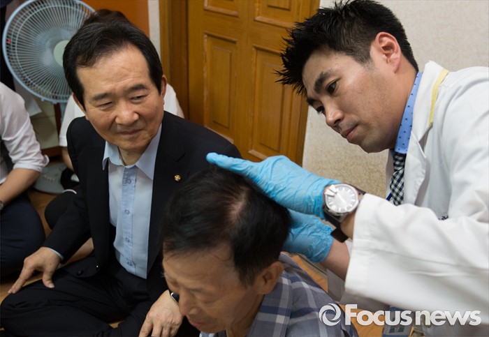 (서울=포커스뉴스) 정세균 국회의장이 2일 오전 서울 종로구 창신동에 거주하고 있는 고령 이산가족 김문각 할아버지(84세, 평안남도 양덕군 청계리) 가정을 방문해 이산가족 상봉 준비를 위한 김 할아버지의 유전자 채취 과정을 지켜보고 있다.