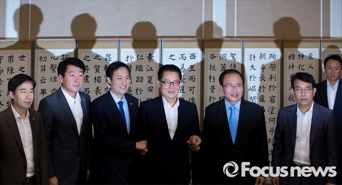 (서울=포커스뉴스) 야3당 원내대표 및 원내대변인이 3일 오전 서울 여의도 국회에서 열린 원내대표 회동에 참석해 손을 맞잡고 사진촬영을 하고 있다. 왼쪽부터 이용호 국민의당 원내대변인, 기동민 더불어민주당 원내대변인, 우상호 더불어민주당 원내대표, 박지원 국민의당 원내대표, 노회찬 정의당 원내대표, 김종대 정의당 원내대변인.