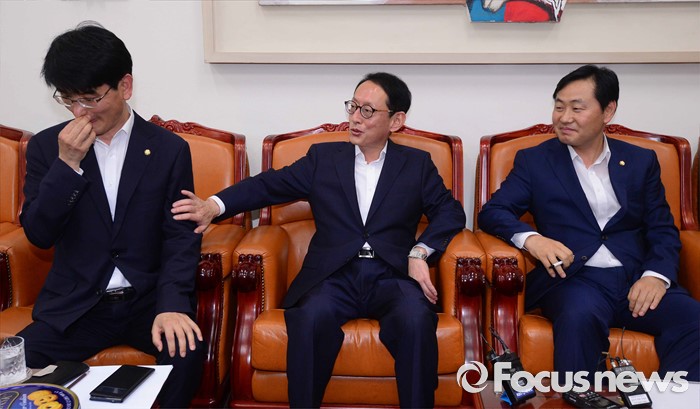 (서울=포커스뉴스) 1일 서울 여의도 국회에서 여야3당 원내수석부대표가 8월 임시국회 세월호 특별법 연장과 추경 등 현안 관련 공조 협의를 위한 회동에서 대화를 나누고 있다. 왼쪽부터 더불어민주당 박완주, 새누리당 김도읍, 국민의당 김관영.