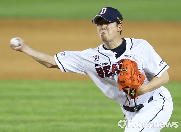 (서울=포커스뉴스) 3일 서울 잠실구장에서 열린 2016 프로야구 LG-두산 경기 8회초 두산 투수 김성배가 투구하고 있다.