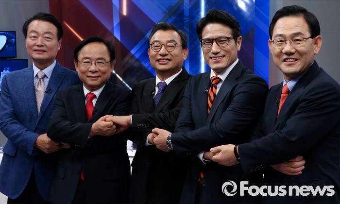 (서울=포커스뉴스) 1일 오후 서울 중구 TV조선 스튜디오에서 새누리당 대표 경선 TV토론회에 앞서 의원들이 포즈를 취하고 있다. 왼쪽부터 한선교, 이주영, 이정현, 정병국, 주호영 의원.