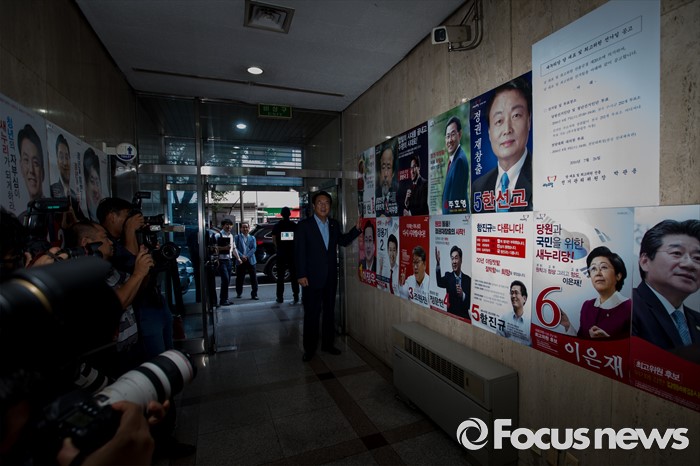 (서울=포커스뉴스) 정진석 새누리당 원내대표가 혁신비상대책위원회의에 참석하기 위해 1일 오전 서울 여의도 새누리당사로 들어서며 오는 9일 전당대회 당대표 및 최고위원 출마 후보들의 포스터를 보고 있다.
