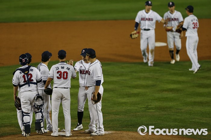 (서울=포커스뉴스) 2일 오후 서울 잠실구장에서 열린 2016 프로야구 LG-두산 경기에서 11점차로 승리한 두산 선수들이 승리를 자축하고 있다.