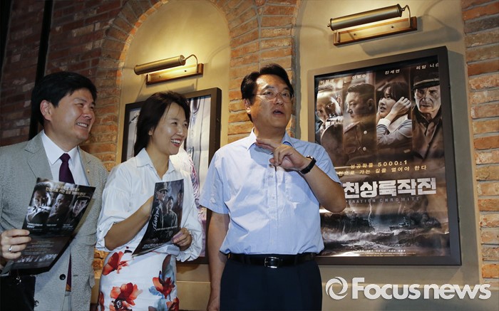 (서울=포커스뉴스) 정진석 새누리당 원내대표가 1일 오후 서울 여의도 한 영화관에서 영화 '인천상륙작전' 관람에 앞서 동료 의원들과 대화하고 있다.