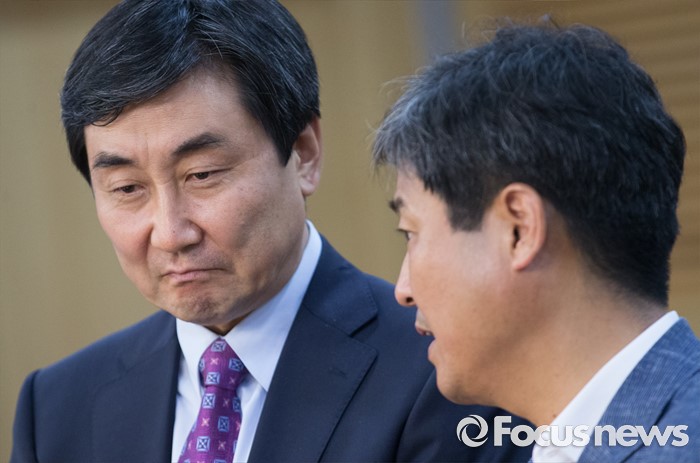 (서울=포커스뉴스) 1일 오후 서울 여의도 국회 의원회관에서 열린 더불어민주당 자치분권민주지도자회의 당대표 후보자 초청 토론회에 참석한 이종걸(왼쪽) 의원이 김영배 상임공동대표 등 참석자들과 대화하고 있다.