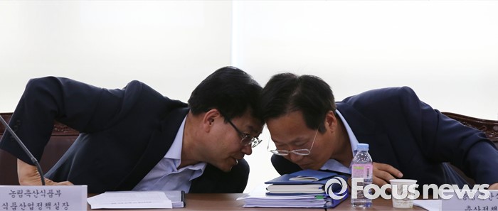(세종=포커스뉴스) 김경규(왼쪽) 농림축산식품부 식품산업정책관이 2일 오후 세종시 정부세종청사 농식품부 대회의실에서 열린 부정청탁 및 금품 수수의 금지에 관한 법률(김영란법) TF회의에서 최명철 농식품부 축산정책과장과 대화하고 있다.