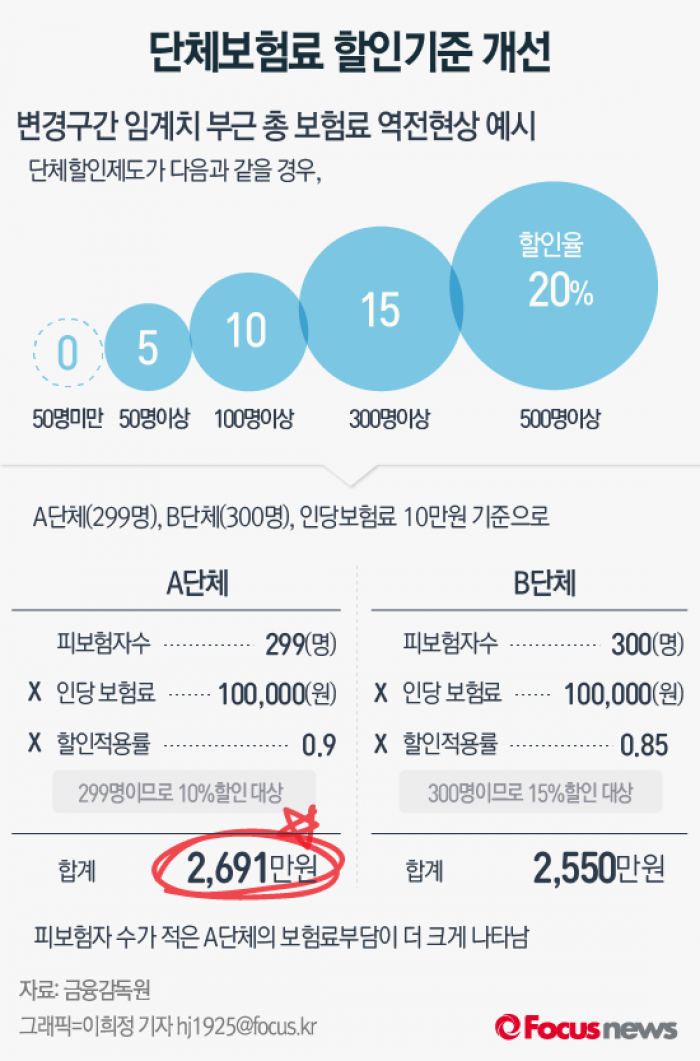 (서울=포커스뉴스) 4일 금융감독원이 단체로 보험에 가입하는 단체상해보험 보험료를 모니터링한 결과 299명의 보험료가 300명의 보험료보다 비싸단 사실을 적발, 이를 보험사에 개선토록 지시했다고밝혔다.