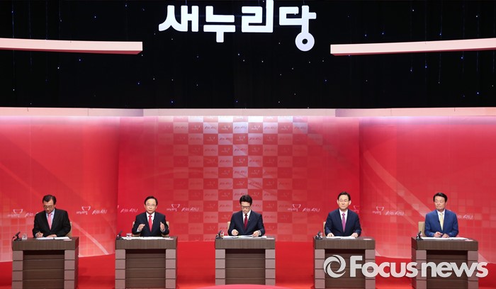 (서울=포커스뉴스) 4일 오후 서울 강서구 등촌동 SBS공개홀에서 열린 새누리당 대표 경선 4차 TV토론회에 참석한 의원들이 토론을 하고 있다. 오른쪽부터 한선교, 주호영, 정병국, 이주영, 이정현 의원.